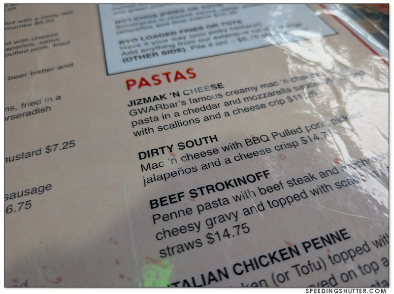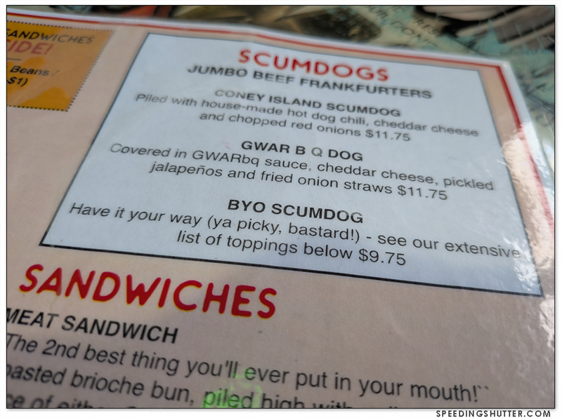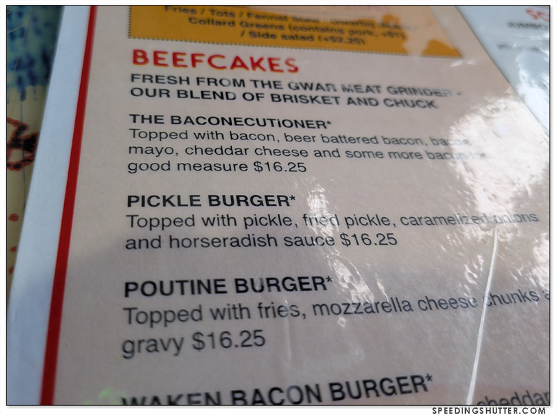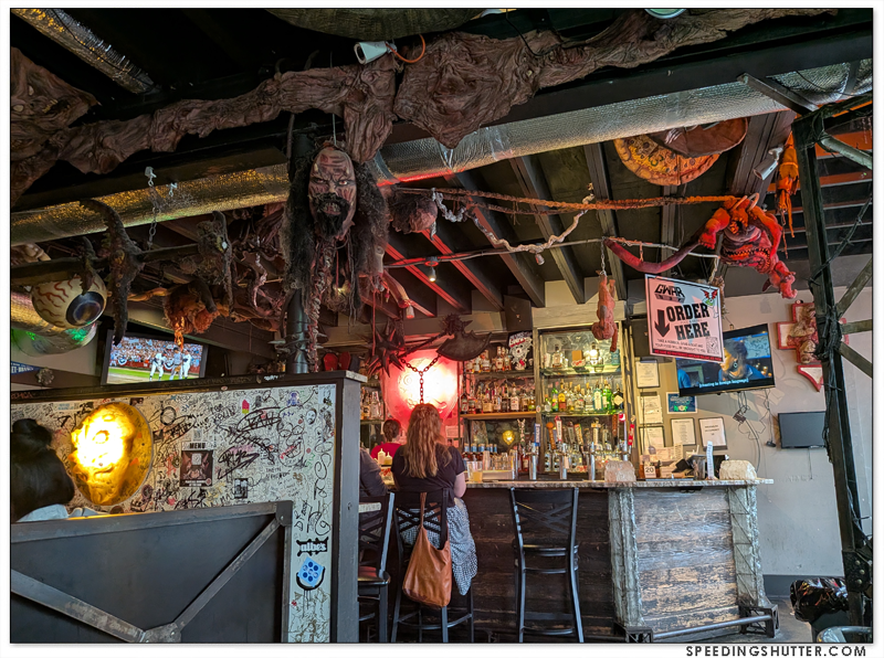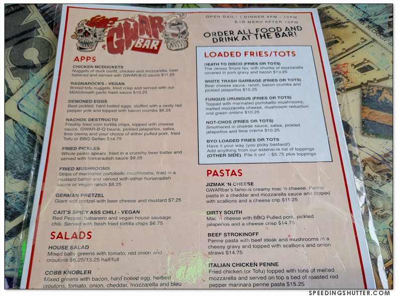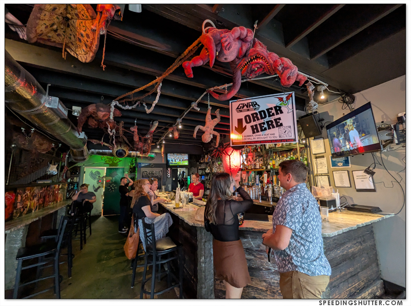 Gwar Bar exhibits the same salty humor that makes up the personality of the band Gwar. One glance at the menu confirms this. The place is on the small side, with a fenced patio where I understand they hold a variety of events, this is a positive for me. I love small places where you can see the entire establishment from your seat. The room is decorated with a massive curation of props from earlier tours of the band, as well as photos and other memorabilia from 40 years of Gwar, and a TV screen playing videos and concert footage. It manages this display of lore without feeling like a tourist attraction. It has a neighborhood joint feel to it, where locals will come grab some dinner after work or as an entree in a night of bar-crawling.