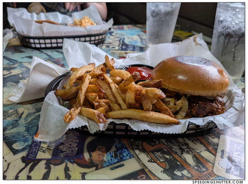 We came in out of the rain (not of blood, just normal rain), were seated at a front window (I love window seats and bar seats, so far I’m winning) and offered menus. We spend a good amount of time looking over every single item on the menu. The menus are great, I had half a mind to steal my menu and frame it on my kitchen wall. I might do that next time, I mean I shouldn’t… but I might. I’ll post some photos to show what I’m talking about. I ordered a “Meat Sandwich” which came in a wax paper-lined plastic basket, and it was just what the doctor ordered. Fantastic sweet and salty and sticky pub fare, probably locally-sourced and super gourmet (as with Cobra Burger, another favorite heavy metal haunt in town) but tastes like my doctor is going to chastise me hard over my next blood tests. I don’t recall what my partner ordered but it also came served in a plastic basket with hand-cut fries, and will likewise do her A1C no justice. Didn’t have any drinks this time, we planned to go to a jazz-banded cocktail bar afterward and drink more than $200’s worth of fancy drinks, so I thought I’d preserve my brain cell allowance for the day and drink here another day.